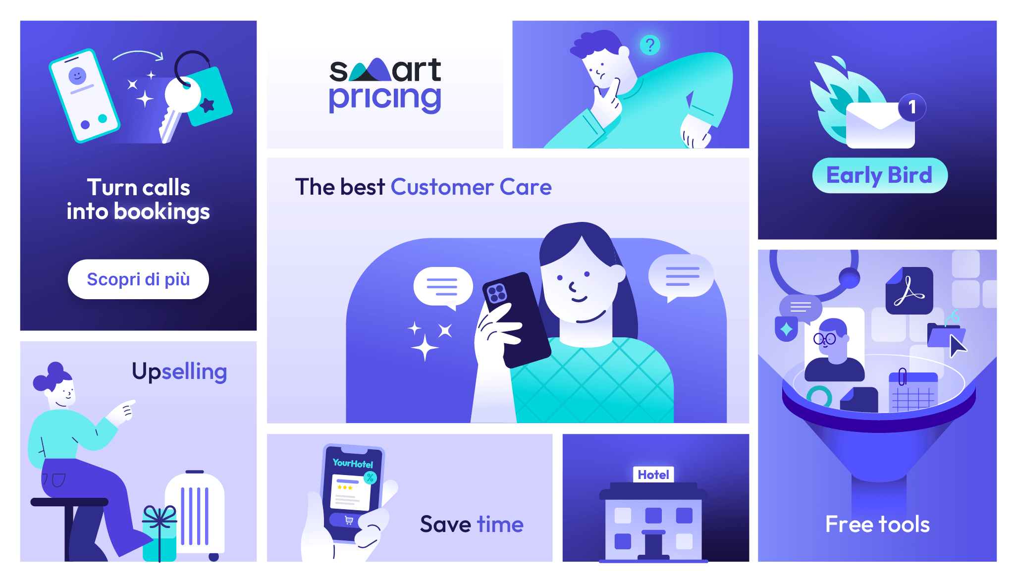 For Smartpricing (a revenue management software), I designed a clear and accessible visual identity and developed visual guidelines, illustrations, and infographics to make the product simple and intuitive. The goal: to help hoteliers immediately grasp the product’s value and technological innovation — even if they are not familiar with revenue management — and to position the brand as a benchmark in an increasingly competitive market.